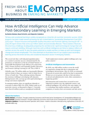 Publication Banking on FinTech in Emerging Markets(International Finance Corporation, Washington, DC, 2022-01) Rose Innes, Cleo; Andrieu, JacquelineDespite near-universal access to financial services in advanced economies, financial exclusion is stubbornly persistent in many emerging markets, leaving huge swaths of low-income populations unbanked or underbanked. FinTech companies, which apply innovative technologies to deliver such services in new ways, have begun to tap into the enormous unmet demand that this represents. These companies are starting to thrive in emerging markets, though regulatory issues, particularly weak consumer protection measures, remain to be resolved in many countries. If these can be overcome, and more progress toward universal access to digital infrastructure can be made, FinTechs will continue to scale and spread.Publication Sustainability-Linked Finance: Mobilizing Capital for Sustainability in Emerging Markets(International Finance Corporation, Washington, DC, 2022-01) de la Orden, Raquel; de Calonje, IgnacioSustainability-linked finance is designed to incentivize the borrower’s achievement of environmental, social, or governance targets through pricing incentives. Launched in 2017, it has now become the fastest-growing sustainable finance instrument, with over $809 billion issued to date in sustainability-linked loans and bonds. Yet these instruments are still nascent in emerging markets, which represent only 5 percent of total issuance to date. This note shares examples of recent sustainability-linked financing, including several involving IFC in various roles, to highlight how investors can utilize these new instruments in emerging markets and mitigate greenwashing risksPublication Financing Deep Tech(World Bank, Washington, DC, 2021-10) Nedayvoda, Anastasia; Delavelle, Fannie; So, Hoi Ying; Graf, Lana; Taupin, LouiseDeep tech companies - those built on advances in biotechnology, robotics, electronics, artificial intelligence, and other advanced technologies—aim to solve complex social and environmental challenges. Today the majority of deep tech companies are being launched in developed countries, yet the solutions they can provide are applicable globally. Many of these solutions are especially critical to emerging markets, as the intractable challenges of climate, health, and connectivity, among other issues, disproportionately affect these nations. Addressing these challenges is a strategic priority for development finance institutions and governments worldwide, so financing deep tech companies and boosting deep tech ecosystems in order to deliver new solutions globally is a pressing matter. Doing so, however, requires substantial capital and carries a higher degree of risk than ordinary venture investments. This note examines the process of financing a deep tech company, including the benefits and drawbacks of currently available types of financing, and suggests examples of promising but not yet widespread alternatives.Publication Artificial Intelligence in Agribusiness is Growing in Emerging Markets(International Finance Corporation, Washington, DC, 2020-05) Cook, Peter; O'Neill, FelicityBusiness models utilizing artificial intelligence can help meet rising global demand for food and support a more inclusive and sustainable food system by: (1) enhancing the resilience of farming methods; (2) reducing the cost of quality inputs and services to underserved farmers; and (3) improving market access to facilitate smallholder farmer integration into regional and global supply chains. Although nascent in emerging economies, applications for artificial intelligence in agribusiness will proliferate as farmers’ access to the Internet and adoption of smart devices increases across low-income countries.Publication Artificial Intelligence: Investment Trends and Selected Industry Uses(International Finance Corporation, Washington, DC, 2019-09) Mou, XiaominThe global race to fund, develop, and acquire artificial intelligence (AI) technologies and start-ups is intensifying, with commercial uses for AI proliferating in advanced and emerging economies alike. AI can increase gross domestic product (GDP) growth in both advanced countries and emerging markets. In energy, AI can optimize power transmission. In healthcare, diagnosis and drug discovery will benefit enormously from AI. In education it can improve learning environments and learning outcomes and can better prepare youth for transition to the workplace. In manufacturing, AI can help design better products in terms of functionality, quality, and cost, and improve predictive maintenance. AI can help extend credit and financial services to those who lack them. The potential impact of AI on transportation and logistics goes far beyond automation and road safety to span the entire logistics chain. Yet with the exceptions of China and India, emerging markets have received only a modest share of global investment in this advanced technology, despite the fact that they may benefit more from AI implementation than advanced economies.Publication The Role of Artificial Intelligence in Supporting Development in Emerging Markets(International Finance Corporation, Washington, DC, 2019-07) Strusani, Davide; Houngbonon, Georges VivienArtificial intelligence (AI) has enormous potential to augment human intelligence and to radically alter how one access products and services, gather information, make products, and interact. In emerging markets, AI offers an opportunity to lower costs and barriers to entry for businesses and deliver innovative business models that can leapfrog traditional solutions and reach the underserved. With technology-based solutions increasingly important to economic development in many nations, the goals of ending poverty and boosting shared prosperity may become dependent on harnessing the power of AI. While emerging markets are already using basic AI technologies to solve critical development cha